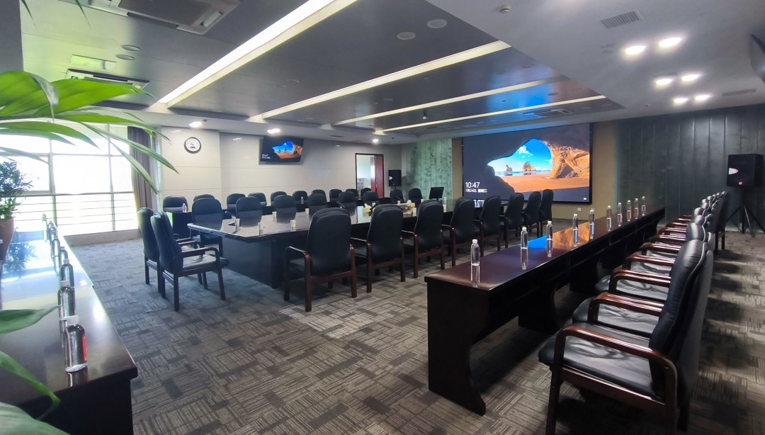 扩声系统根据会议室空间设计,主扩音箱为四只全频音箱,可以将演讲者的声音放大并清晰传递给与会者。针对对现场环境进行调试,达到语音清晰、音质良好、声场均匀的设计目标。